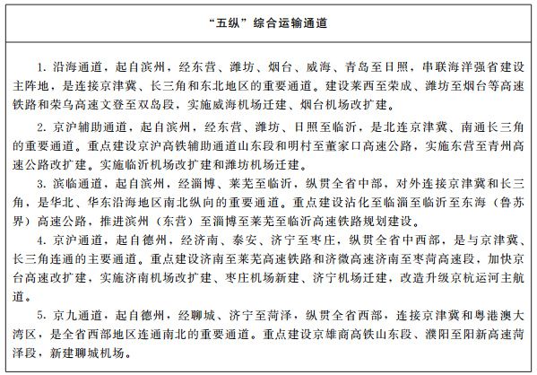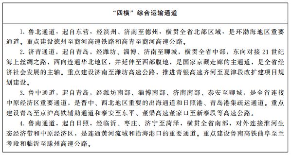 1、完善四横五纵通道。积极融入国家京津冀—长三角主轴、京哈走廊和京藏走廊。在基本形成鲁北、济青、鲁南三个横向通道基础上,加快完善鲁中横向通道,提升沿海港口辐射能力和西向铁水联运效能,积极融入共建“一带一路”高质量发展;在基本形成沿海、京沪辅助、京沪、京九四个纵向通道基础上,加快完善滨临纵向通道,强化与京津冀、长三角区域连接。