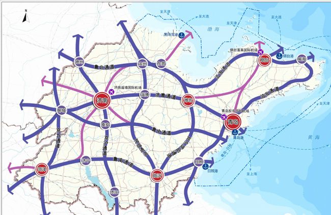 建设山东半岛高级港口群,打造和培育青岛、济南2个国际性综合交通枢纽城市,打造和培育烟台、潍坊、临沂、菏泽4个全国性综合交通枢纽城市,打造和培育济南机场、青岛机场、烟台机场、临沂机场4个枢纽机场,加快建设一批综合交通枢纽设施,构建多层次、一体化的“1+2+4+4+N”综合交通枢纽体系。
