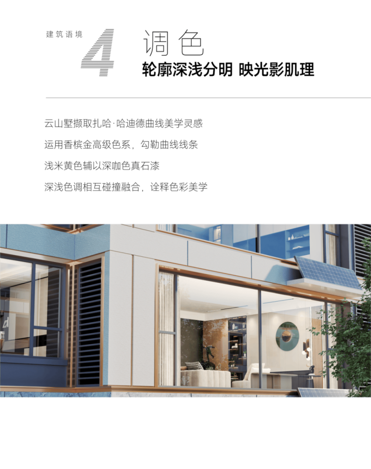 吉开·云山墅甄选高品质立面最终选定石材、铝板搭配真石漆的建筑立面组合大气简洁不失稳重,精致内敛不失尊贵各种材质的相辅相成,加上铝板的点睛之笔方才达到理想效果,使建筑质感历久弥新