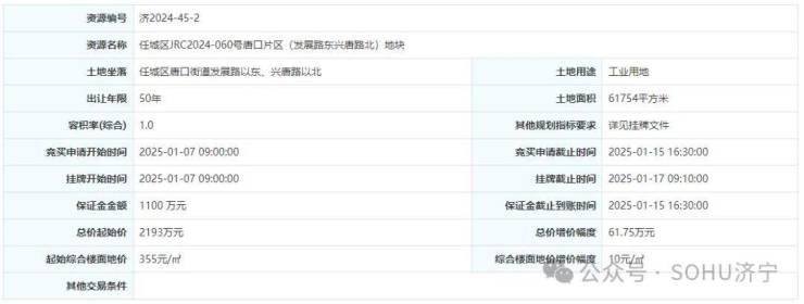 土地位于:任城区唐口街道发展路以东、兴唐路以北;土地面积:61754㎡(约93亩);土地用途:工业用地;出让年限:50年;容积率不小于1.0;起始价:2193万元,综合楼面价起价:355元/㎡;最终成交价为:2193万元(约24万元/亩),综合楼面地价成交价:355元/㎡;溢价率:0.0%;