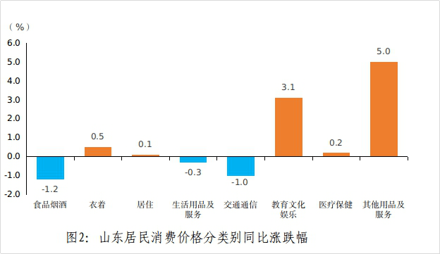 9月份,山东居民消费价格环比上涨0.1%。其中,城市上涨0.1%,农村上涨0.4%;食品价格上涨0.1%,非食品价格上涨0.2%;消费品价格上涨0.3%,服务价格下降0.1%。