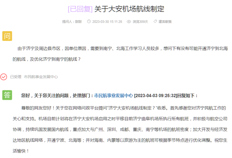近日,有网友通过济宁市网络问政平台留言咨询,济宁大安机场建设进展到什么阶段了,何时试航,何时通航?