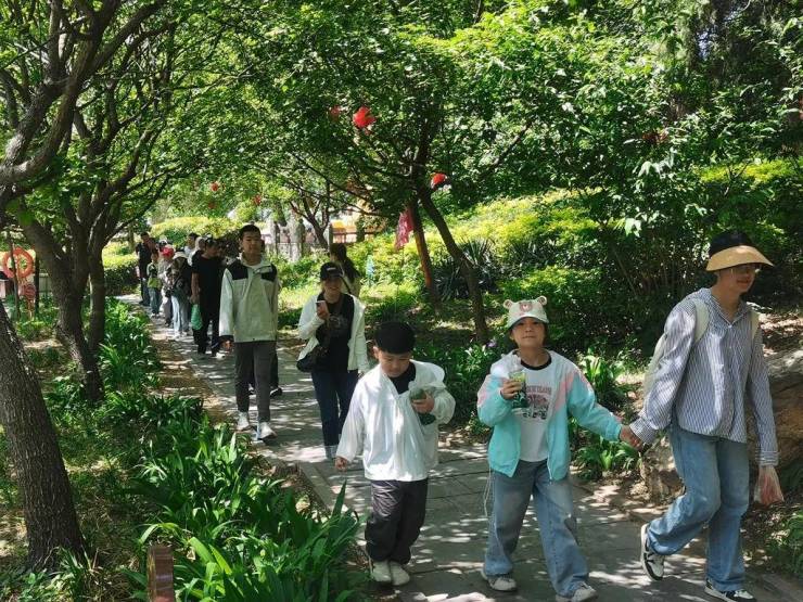 五一当天,阅湖尚儒文创街热闹非凡。川上咖啡厅、乡村理想生活馆、游慕茶舍等场馆艺术性十足,配上中国吉祥画、红灯笼等传统元素装饰,显得别有意趣。街区的“虎咬瓜”店铺内,游客络绎不绝,以泗水地瓜为原料的创意产品受到广大游客的喜爱。研学基地内来自济宁地区内外的研学团队络绎不绝,泥塑、木工、扎染、敲拓染在孩子们的手中一一成型,孩子们在研学中感悟中华优秀传统民间技艺的魅力。