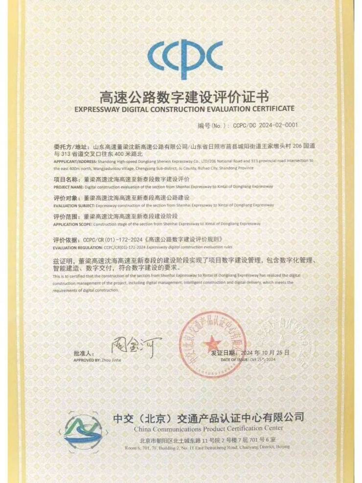 在项目建设过程中,董梁高速日照段积极推进数字化设计、建管、运维应用场景,致力于打造省内首条全生命周期数字化交付高速公路。目前,项目已打通全寿命周期数据通道,并取得全国首个涵盖设计、建设、运维三阶段数字化应用的评价证书。