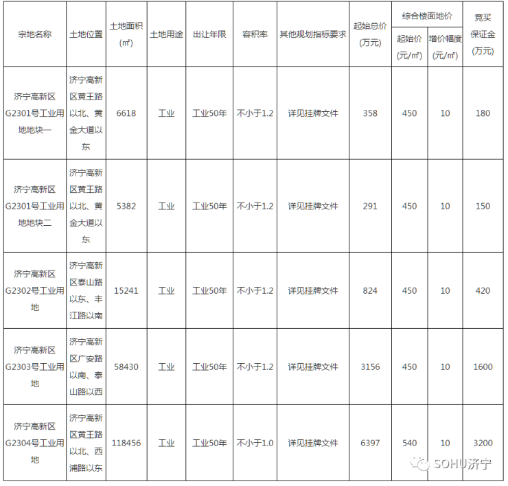 土地位于:济宁高新区泰山路以东、丰江路以南;土地面积:15241㎡(约23亩);土地用途:工业用地;出让年限:50年;容积率不小于1.2;起始价:824万元,综合楼面价起价:450元/㎡;