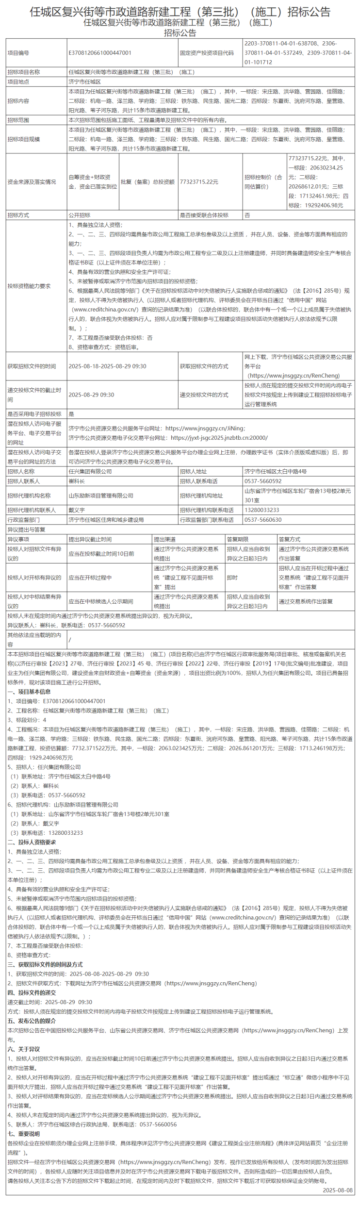 估算投资7732万元!济宁市任城区15条市政道路新建工程招标公告发布