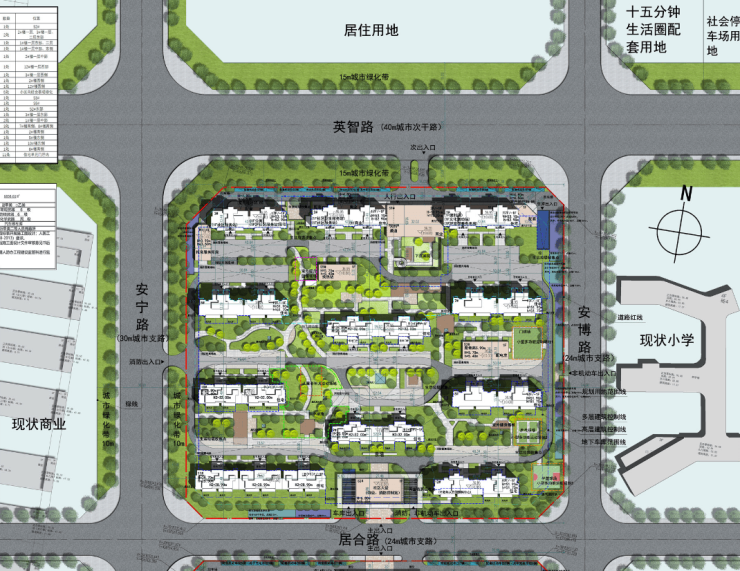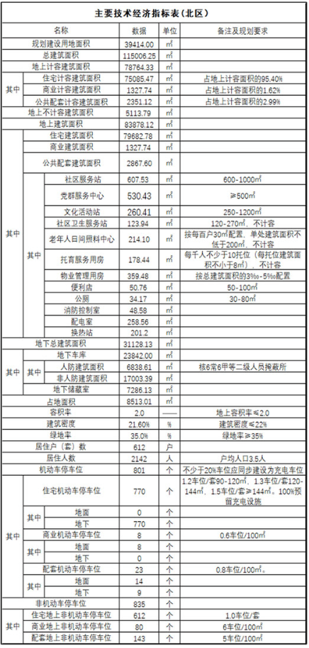 地块为商住用地,项目建设用地面积39414㎡(约59亩);总建筑面积:115006.25㎡;其中,地上建筑面积为83878.12㎡,计容面积78764.33㎡,地上不计容面积5113.79㎡;地下建筑面积为31128.13㎡;容积率为2.0;建筑密度21.6%;绿地率35%;计划总居住户(套)数为612户(套),居住人数约2142人(按3.5人/户预算);建筑类型包括住宅、商业、公服配套设施等;规划机动车停车位801个,非机动车位835个。