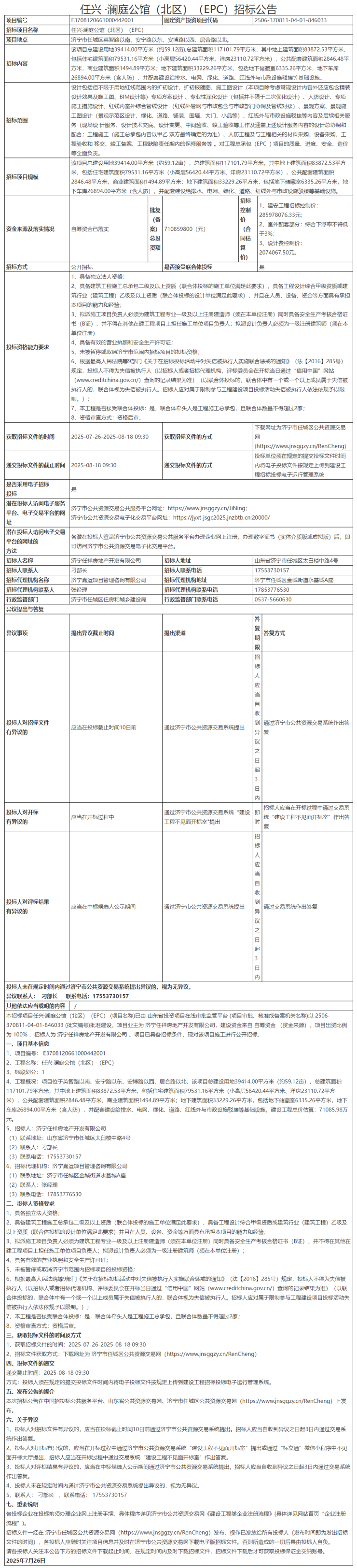 本招标项目任兴·澜庭公馆(南区)(EPC) (项目名称)已由 山东省投资项目在线审批监管平台 (项目审批、核准或备案机关名称)以 2506-370811-04-01-730669 (批文编号)批准建设,项目业主为 济宁任旺房地产开发有限公司,建设资金来自 自筹资金 (资金来源),项目出资比例为 100% ,招标人为 济宁任旺房地产开发有限公司 。项目已具备招标条件,现对该项目施工进行公开招标。
