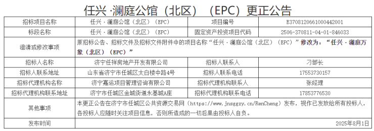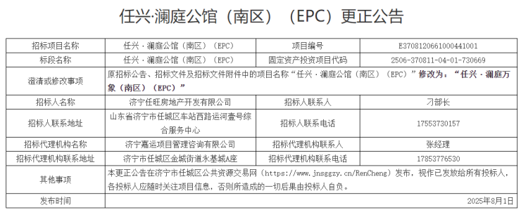 2025年7月30日,济宁市自然资源和规划局发布任兴·澜庭万象(北区)、(南区)及幼儿园项目地块建设用地规划许可批前公告。