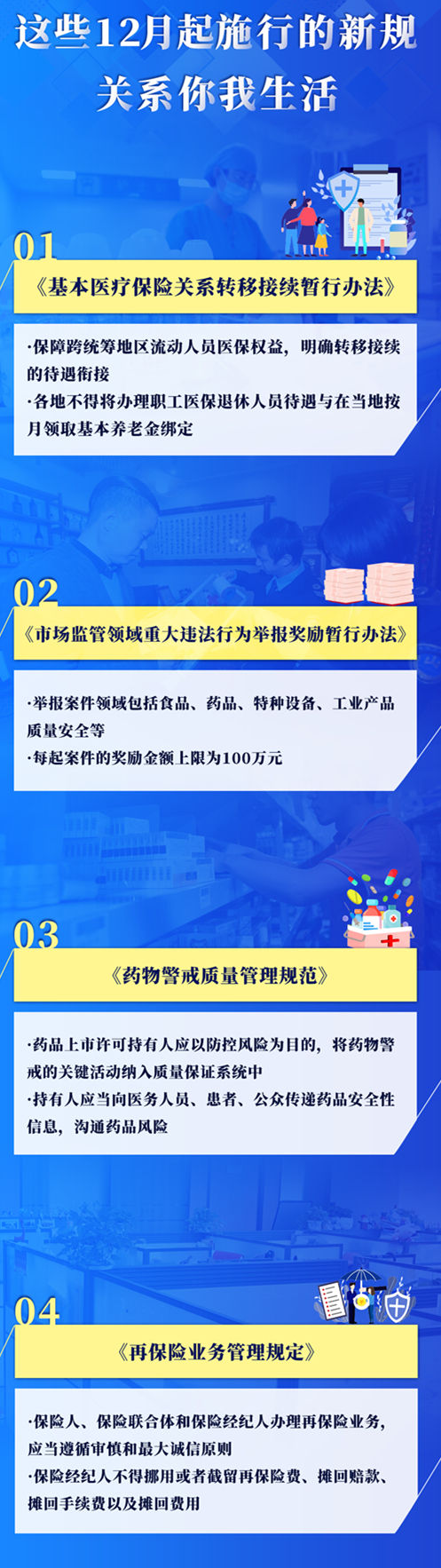 当时光的脚步来到2021年的最后一个月,一批影响你我的重要新规也将开始施行。流动人员的医保权益更有保障,举报市场监管领域重大违法行为可获奖励,药品安全相关管理规范进一步完善……美好的生活,见证法治的进步。