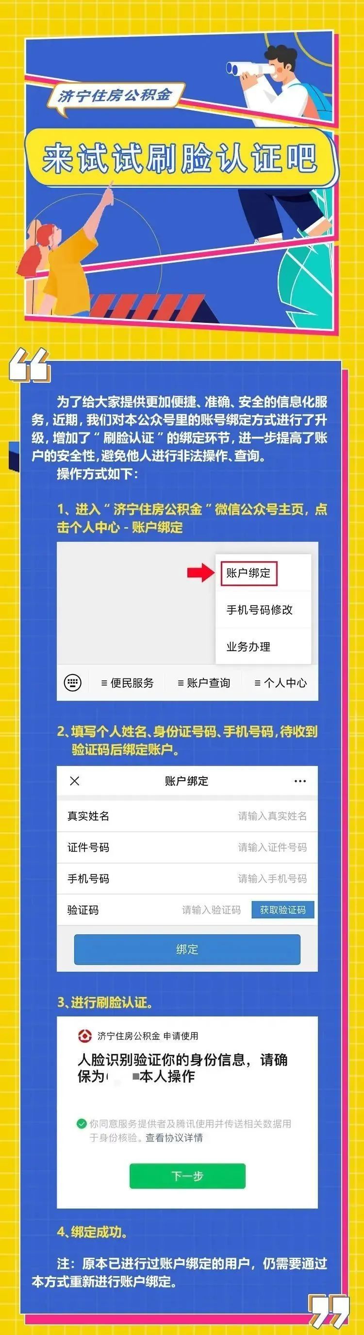 近期,济宁市住房公积金管理中心对官方公众号里的账号绑定方式进行了升级,增加了“刷脸认证”的绑定环节,进一步提高了账户的安全性,避免他人进行非法操作、查询。