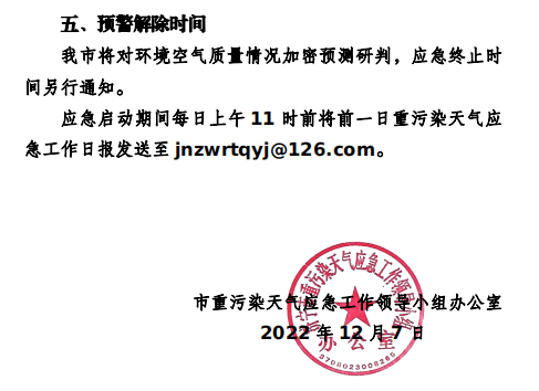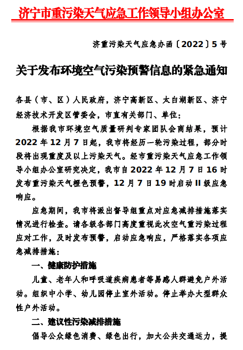 根据我市环境空气质量研判专家团队会商结果,预计2022年12月7日起,济宁市将经历一轮污染过程,部分时段将出现重度及以上污染天气。经市重污染天气应急工作领导小组办公室研究决定,济宁市自2022年12月7日16时发布重污染天气橙色预警,12月7日19时启动II级应急响应。