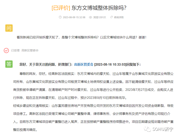 对此,高新区管委会回复如下:经高新区法院核实:东方文博城内的摩天轮、过山车等属于山东集城文化旅游实业有限公司所有,山东集城文化旅游实业有限公司租赁文博城土地使用权设置上述设备。因不能清偿摩天轮、过山车等供应商货款被申请破产清算,在清理破产财产时对摩天轮、过山车等进行公开拍卖,2023年7月27日成交,由购买人进行拆除,现在正在拆除摩天轮、过山车过程中,预计2023年9月10日前拆除完毕。