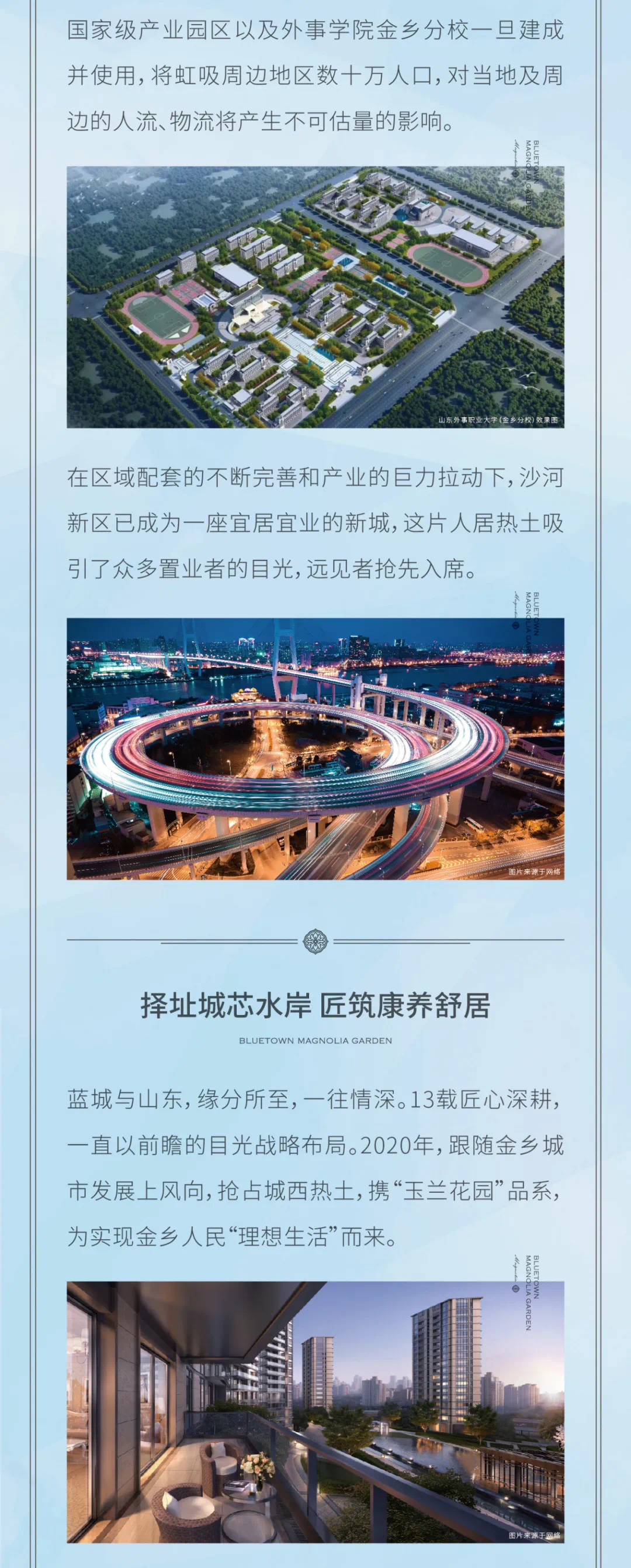 蓝城·玉兰花园承千年年历史文化荣耀,择址金乡城市发展前沿,外部占据优越区位和醇熟生活配套,内部集园林、智能、全龄、品质于一体,匠心臻筑,以建面约115-180㎡水岸低密洋房,焕新金乡人居新时代!