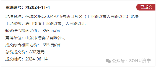 地块名:任城区JRC2024-015号唐口片区(工业路以东人民路以北)地块【山东添禧食品有限公司竞得】