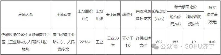 从地块的具体分布上看,位于任城区。从土地用途来看,为工业用地。土地面积为22584㎡,约34亩;起始价为802万元。