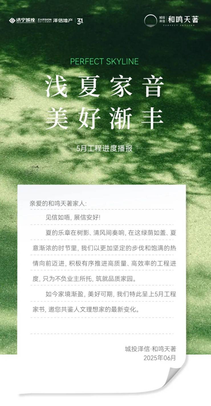 夏的乐章在树影、清风间奏响,在这绿荫如盖、夏意渐浓的时节里,我们以更加坚定的步伐和饱满的热情向前迈进,积极有序推进高质量、高效率的工程进度,城投泽信·和鸣天著只为不负业主所托,筑就品质家园。