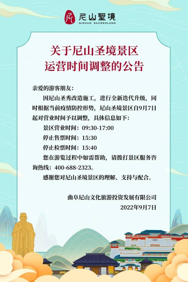 9月7日起,尼山圣境景区运营时间调整,具体如下: