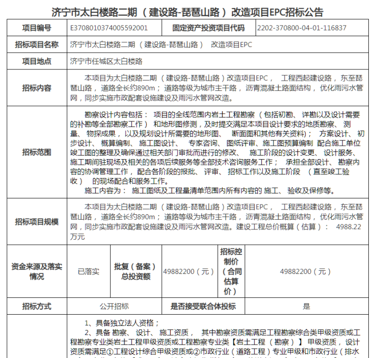 近日,搜狐网·搜狐焦点济宁小编在相关渠道获悉:济宁市太白楼路二期 (建设路-琵琶山路) 改造项目发布EPC招标公告,具体如下: