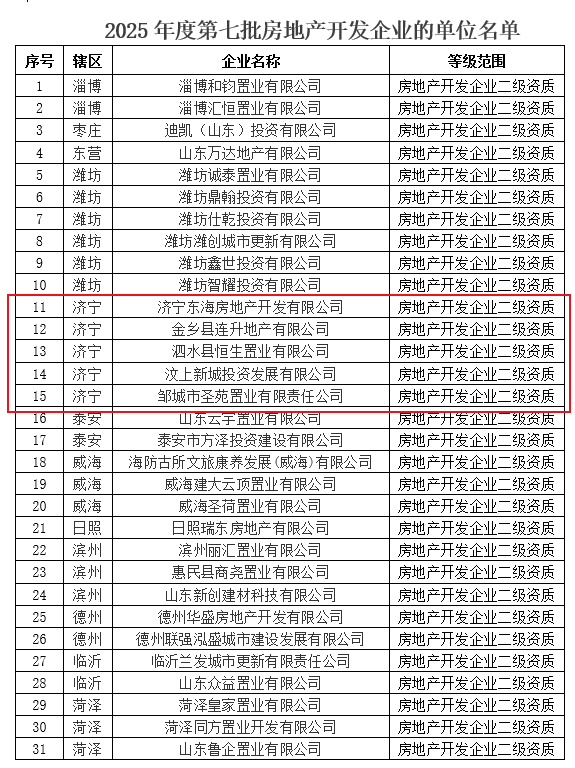 济宁5家!山东省2025年度第七批房地产开发企业资质名单发布