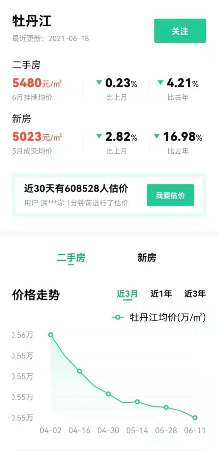 数据显示,牡丹江市二手房6月挂牌均价为5480元/㎡,比去年下降的4.21%;新房价格更低,5月成交均价为5023元/㎡,比去年下降16.98%。