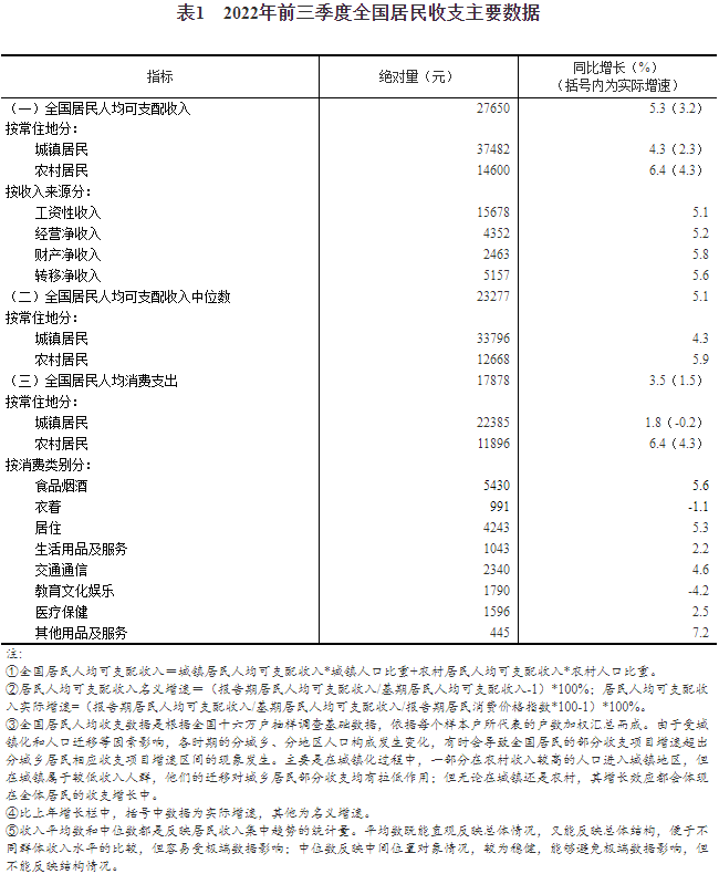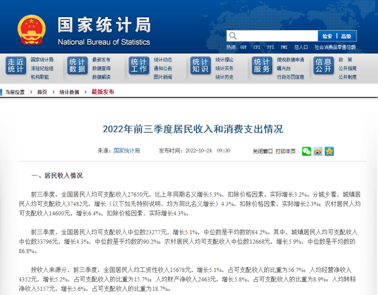 10月24日,国家统计局发布2022年前三季度居民收入和消费支出情况: