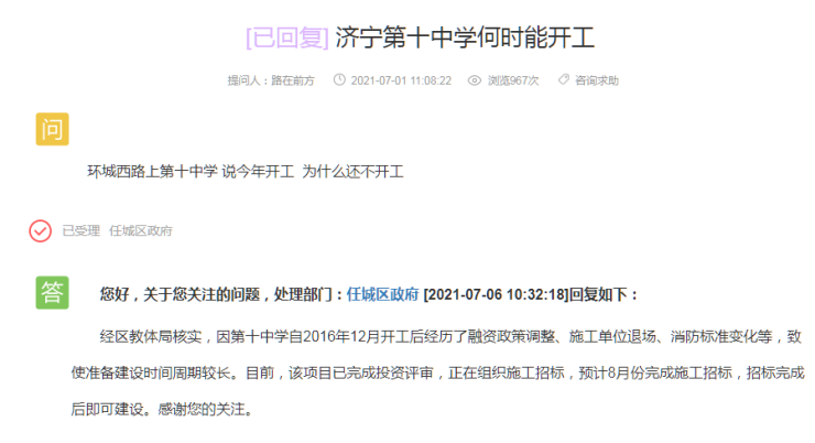 对此,任城区政府回复如下:因第十中学自2016年12月开工后经历了融资政策调整、施工单位退场、消防标准变化等,致使准备建设时间周期较长。目前,该项目已完成投资评审,正在组织施工招标,预计8月份完成施工招标,招标完成后即可建设。