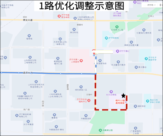 1路:枫叶小镇奥特莱斯发车,沿海川路向南至鸿广路,沿鸿广路向西至高新大道,沿高新大道向北至孟子大道,沿孟子大道向西进入原线路运营至终点站。调整后撤销:人民医院东院枢纽、人民医院东院区东共2站;新增:枫叶小镇奥特莱斯、鸿雁湖公园北、市社会福利中心、绿色家园东门共4站。