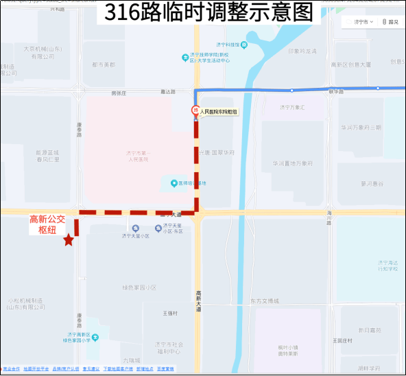 316路(临时调整):临时调整至高新公交枢纽发车,沿康泰路向北至孟子大道,沿孟子大道向东至高新大道,沿高新大道向北进入原线路运营至终点站。临时停靠:人民医院东院区东、人民医院东院区、高新公交枢纽共3站。