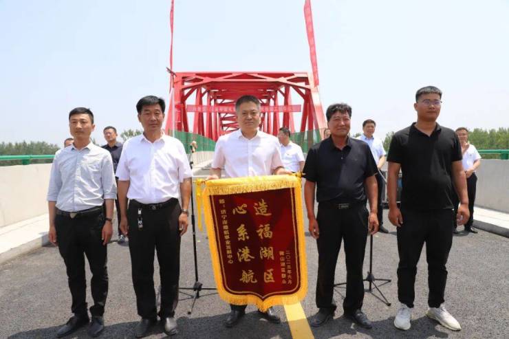在通车仪式上,微山湖区群众代表向济宁市港航事业发展中心赠送了锦旗,感谢中心对当地群众生产生活和产业发展的关心关怀。该桥建成通车后, 打通了高楼乡运河东西两岸的交通“瓶颈”,改善了鲁苏两省群众生产生活的交通条件,提升了京杭运河西线主航道的通航能力,对于服务群众和促进地方经济发展、乡村振兴具有十分重要的意义。