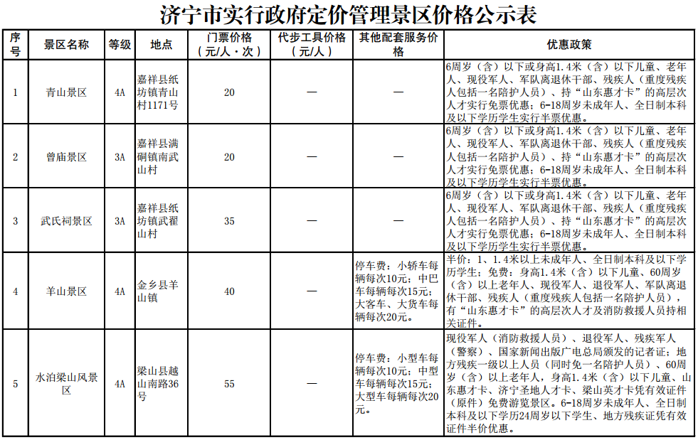 日前,济宁市发展和改革委员会在济宁市人民政府官网发布《济宁市实行政府定价管理景区价格公示表》,详情如下: