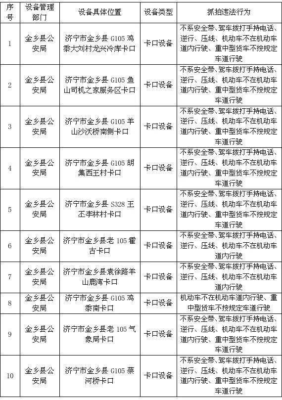 为维护道路交通秩序,保障交通参与者出行安全,依据《中华人民共和国道路交通安全法》及有关道路交通安全法律法规, 金乡县公安局交通管理大队在辖区道路新增、改造10处交通技术监控设备,现对新增、改造设备予以公示,自公示之日起7个工作日后,将对有关交通违法行为依法管理。希望广大驾驶员自觉遵守交通法律法规。