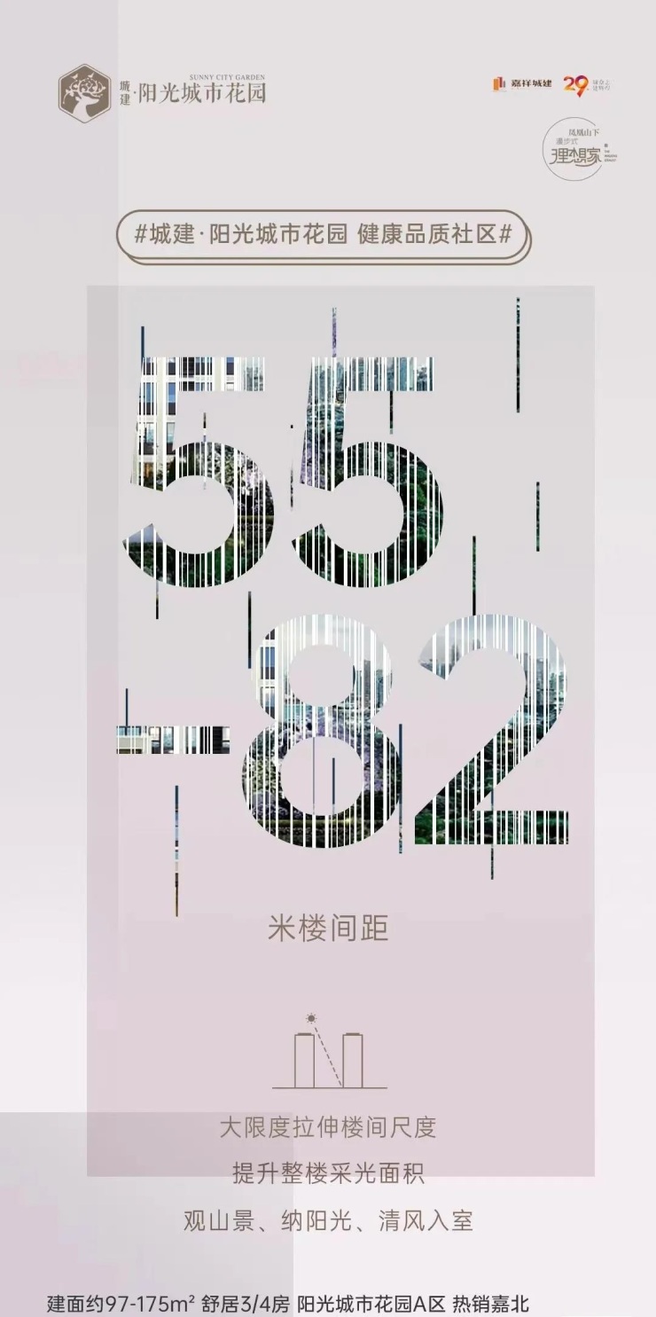 阳光城市花园55-82米楼间距,大限度拉伸楼间距尺度,提升整楼采光面积。观山景、纳阳光、清风入室。