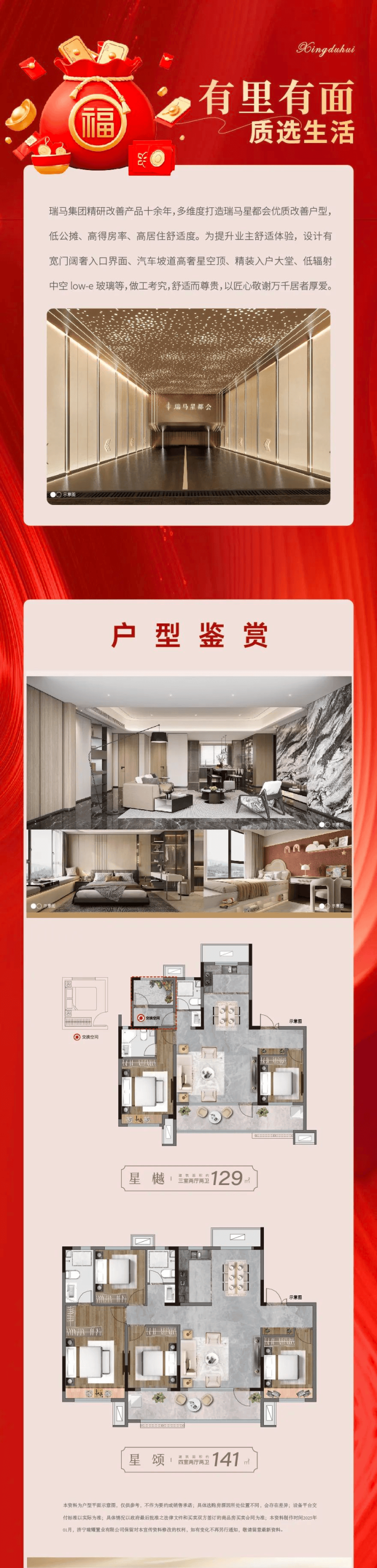 瑞马集团精研改善产品十余年,多维度打造瑞马星都会优质改善户型,低公摊、高得房率、高居住舒适度。为提升业主舒适体验,设计有宽门阔奢入口界面、汽车坡道高奢星空顶、精装入户大堂、低辐射中空low-e玻璃等,做工考究,舒适而尊贵,以匠心敬谢万千居者厚爱