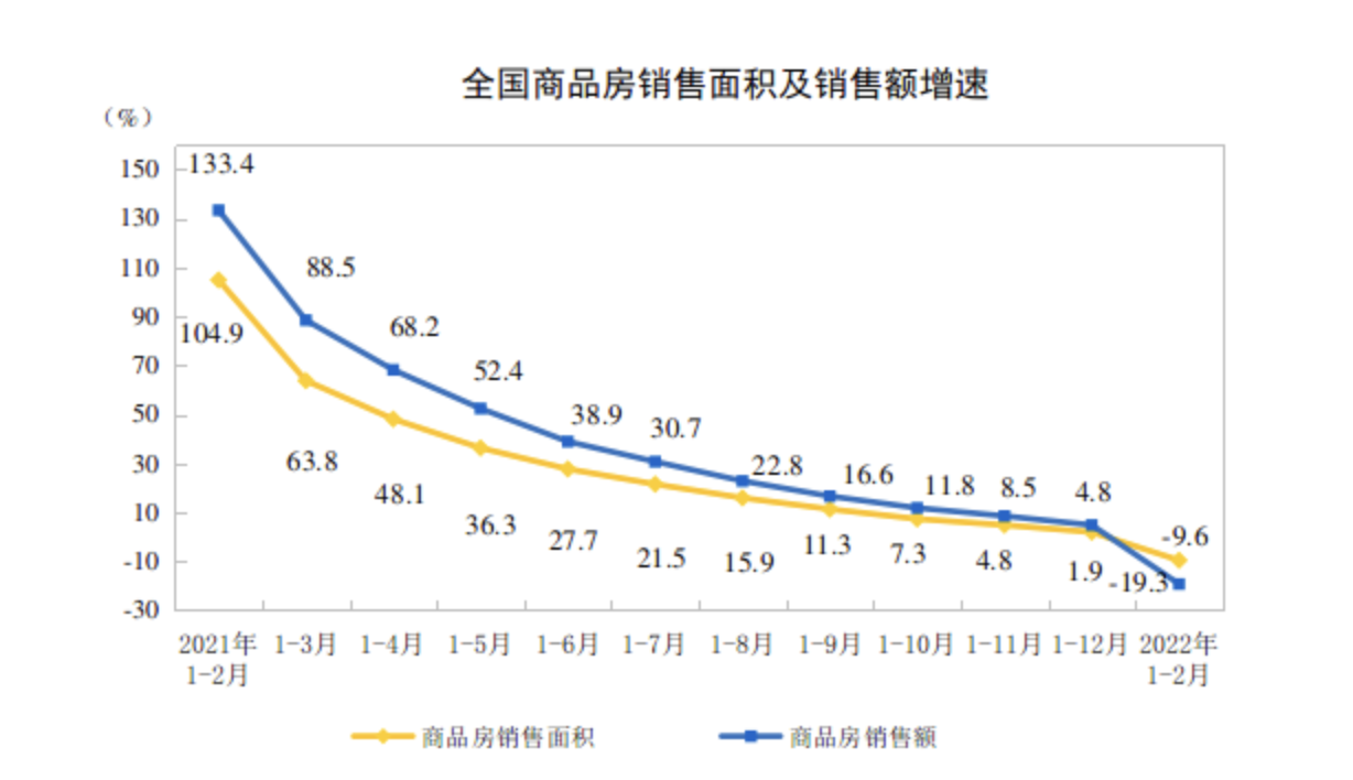3月15日,国家统计局披露数据显示,2022年前2个月,商品房销售面积15703万平方米,同比下降9.6%,其中,住宅销售面积下降13.8%;商品房销售额15459亿元,下降19.3%,其中,住宅销售额下降22.1%。