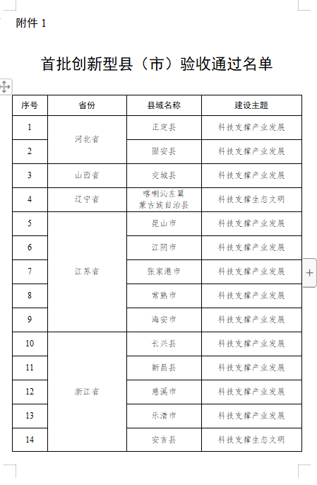 为贯彻落实国务院办公厅《关于县域创新驱动发展的若干意见》,根据《创新型县(市)建设工作指引》,科技部于2018年启动建设全国首批52个创新型县(市)。三年建设期满后,经组织专家评审、现场复核及综合评议,形成首批创新型县(市)验收通过名单。