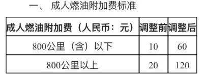 三、按成人全票价的百分之十计价的婴儿免收燃油附加费
