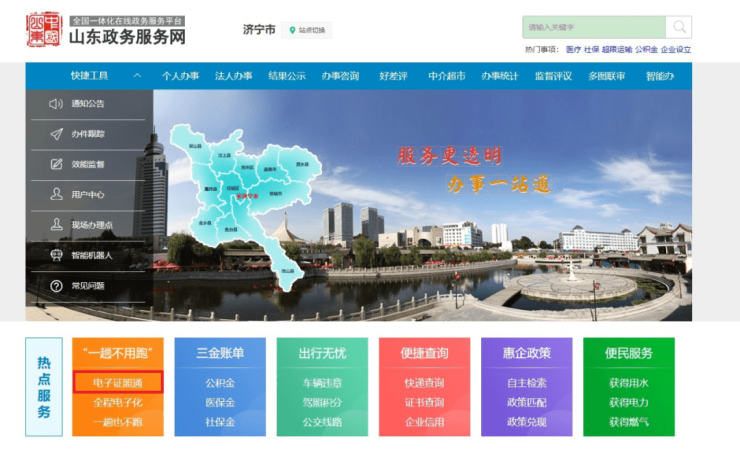 第一步:登录山东政务服务网·济宁站首页,选择“电子证照通”服务专区。