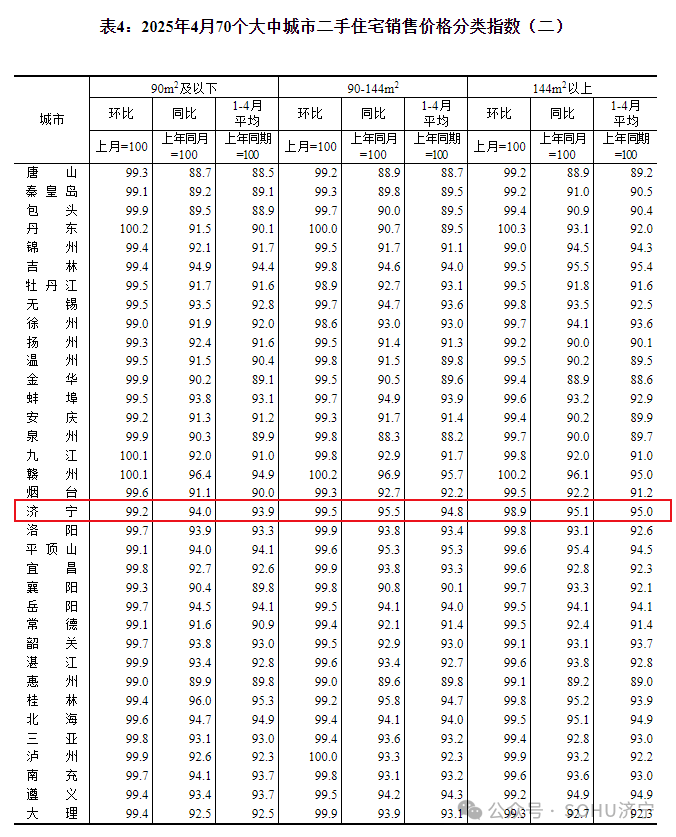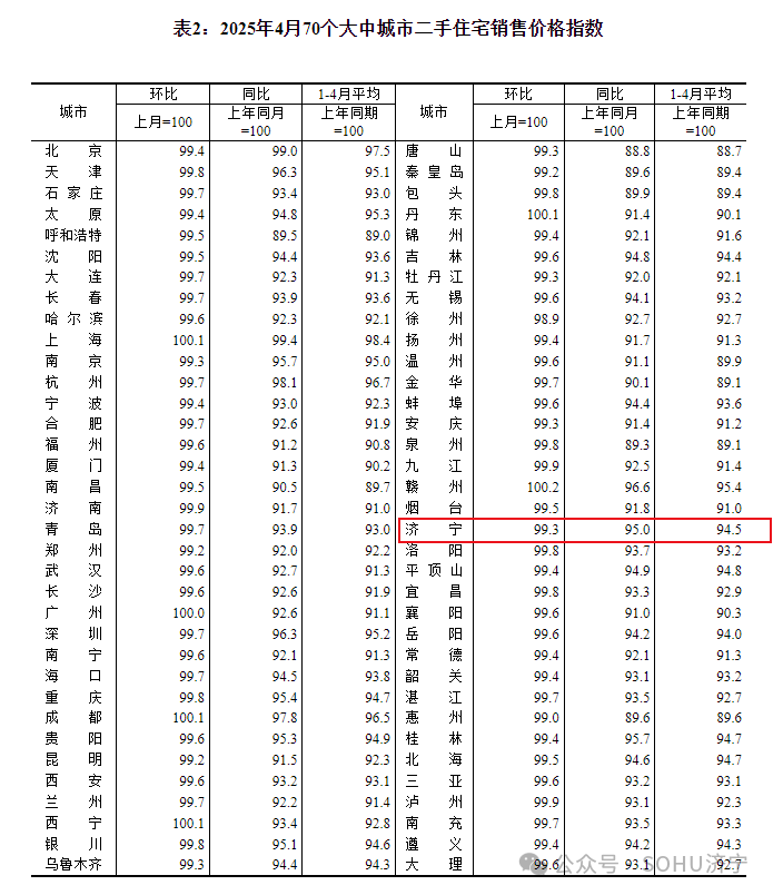 搜狐网济宁小编注意到:今早9点30分,国家统计局发布了2025年4月份70个大中城市商品住宅销售价格变动情况统计数据。2025年4月份济宁新建商品住宅销售价格环比下降0.3个百分点。