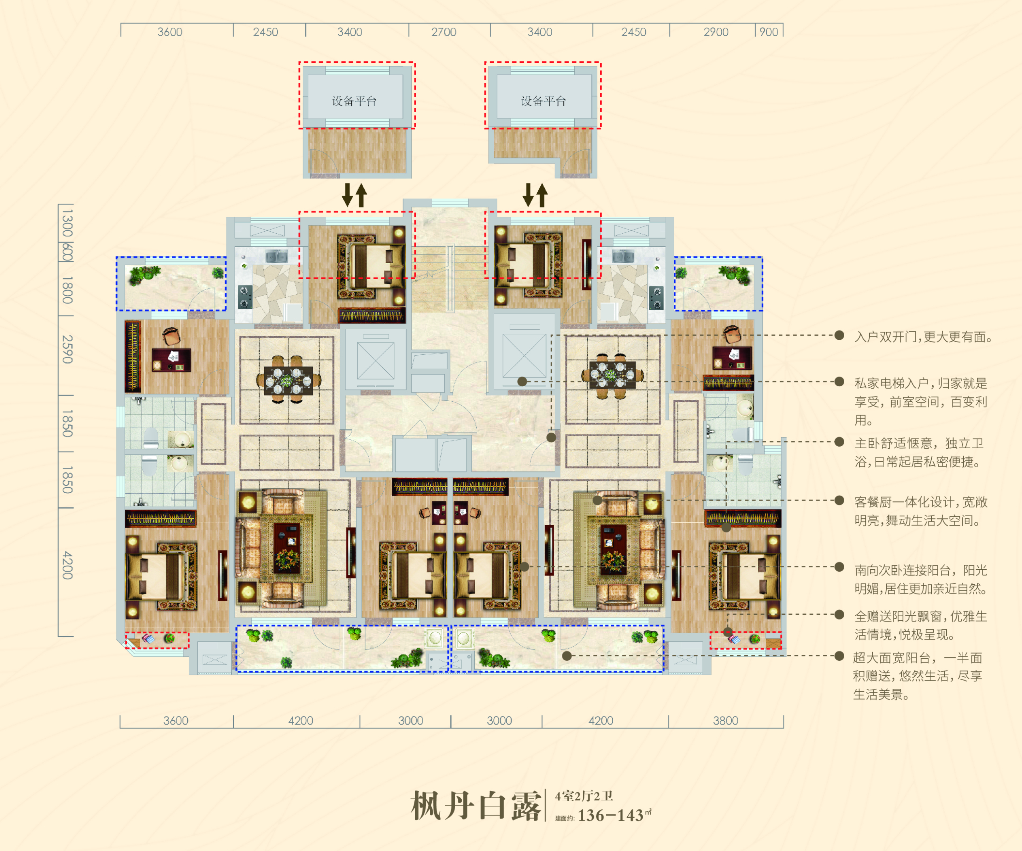 公用瑞马新天地打造建面约136—143㎡明星四房,优质利用空间的方正布局,带来更宽敞的居住体验;三开间朝南,生活与阳光不期而遇;餐、客一体大通厅设计,放大生活空间,待客倍感从容;南向宽尺观景阳台,与秀美风景撞个满怀!