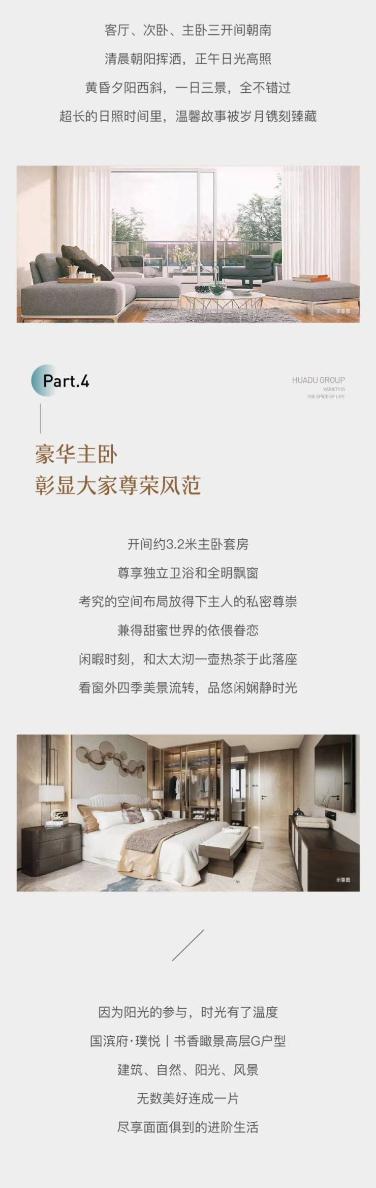 华都国滨府·璞悦开间约3.2米主卧套房,尊享独立卫浴和全明飘窗考究的空间布局放得下主人的私密尊崇,兼得甜蜜世界的依偎眷恋。闲暇时刻,和太太湖一壶热茶于此落座。看窗外四季美景流转,品悠闲娴静时光。