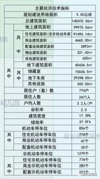 项目规划用地5.0公顷(约75亩);总建筑面积:140410.06㎡;其中地上建筑面积为99975.56㎡、地下建筑面积为40434.5㎡;容积率为2.0;建筑密度17.39%;绿地率37.19%;计划居住户(套)数为774户(套),居住人数约2477人(按3.2人/户预算);建筑类型包括住宅、商业、公共配套等;规划机动车停车位856个,非机动车位1279个。