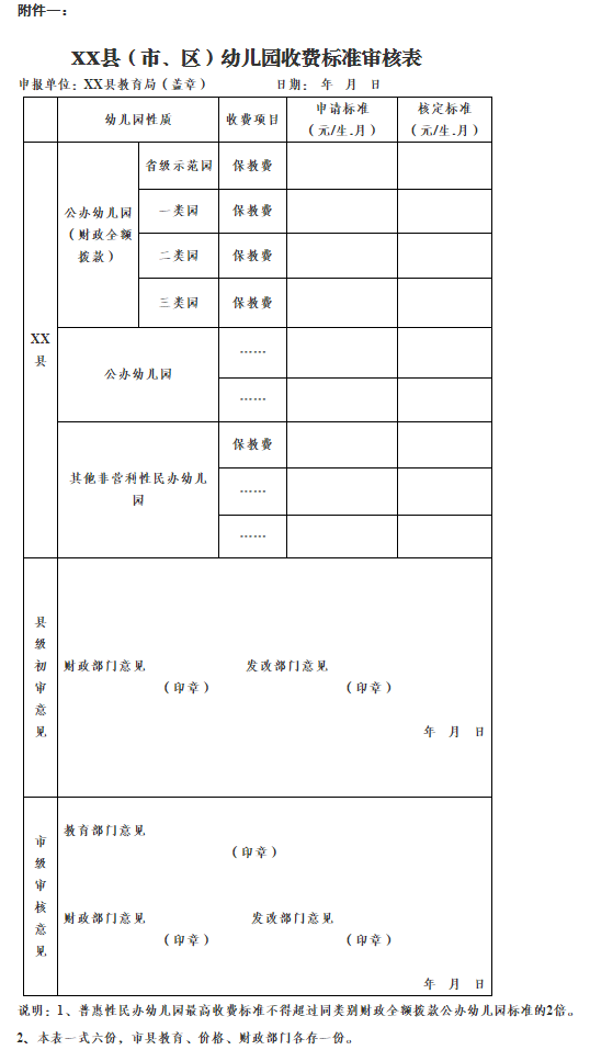 附件一:XX县(市、区)幼儿园收费标准审核表