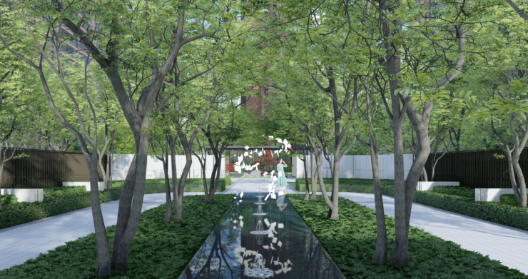 通过简约的设计符号,诠释拼贴的艺术,延续建筑的艺术特色, 重视建筑元素与景观的融合,打造沉浸式景观体验。