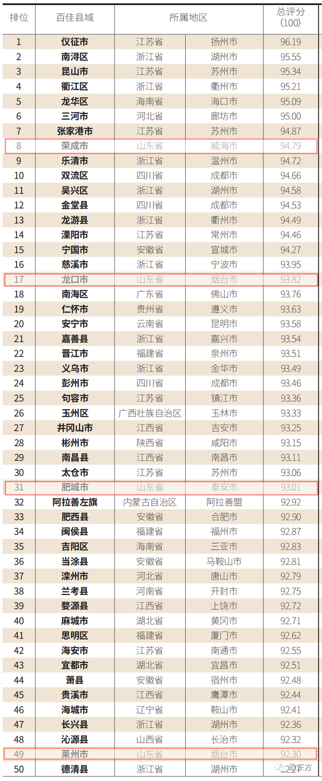 “2021中国较具发展潜力百佳县市”榜单发布。百佳榜中,共有25个省份的县域榜上有名,山东荣成市、龙口市、肥城市、莱州市、邹平市、曲阜市、滕州市等7个城市上榜。