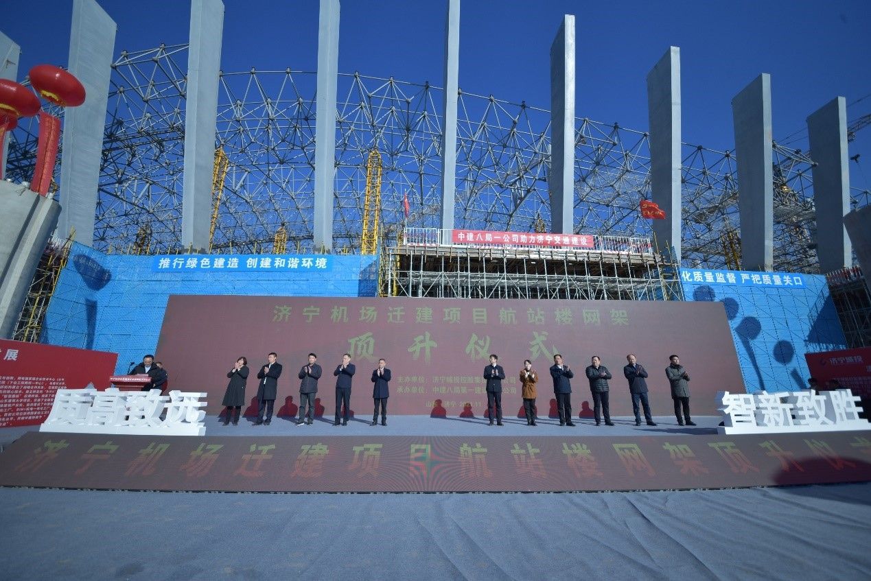11月10日上午,由中建八局一公司承建的济宁机场迁建项目航站楼钢结构网架顶升合拢正式开始,标志着济宁机场迁建项目成功突破一系列施工技术重难点,顺利完成航站区主体结构施工任务,幕墙、金属屋面和内部装饰装修将随之同步启动。