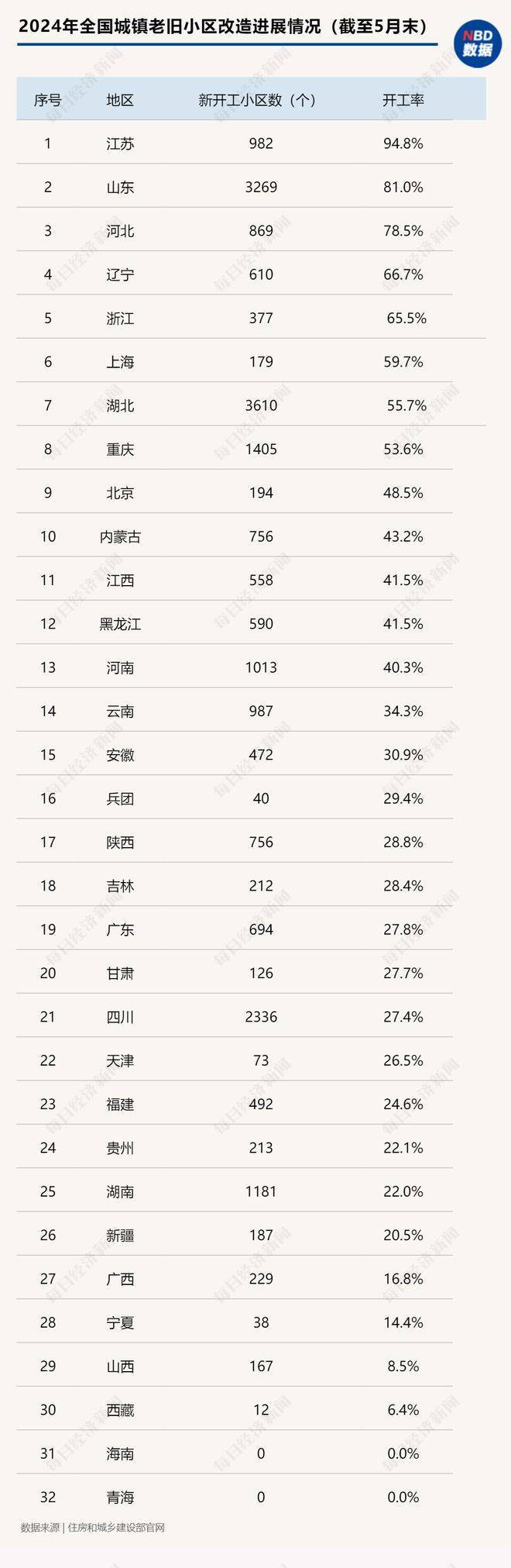 截至5月末,江苏省以982个新开工小区数和94.8%的开工率居全国首位。紧随其后的是山东省,新开工小区数达到3269个,开工率为81.0%;河北省以869个新开工小区数和78.5%的开工率位列第三。新开工小区数量超过1000个的地区共有6个,分别是山东、湖北、重庆、河南、四川和湖南。