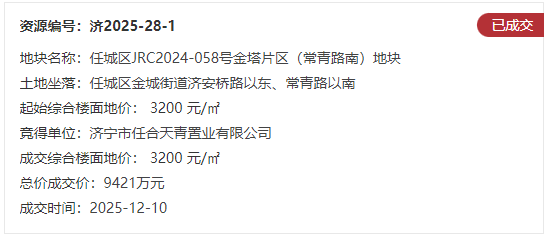 最终,济宁市任合天青置业有限公司成功摘得1宗地块
