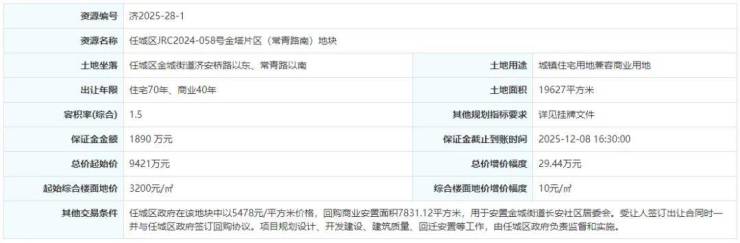 从该宗地块的具体分布上看,位于任城区。从土地用途来看,为商住用地。土地面积为19627㎡,约29.4亩;起始价为9421万元。