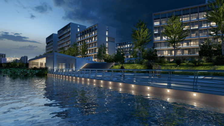 项目规划近30%园区整体绿化率,形成“一带两轴两心多点”的景观系统,近1.5万㎡公共绿地面积,使建筑掩映在庭院绿植中,同时借助基地的开放性,与北邻滨河城市公园融为一体,为企业造起一个健康办公的天然防护罩。